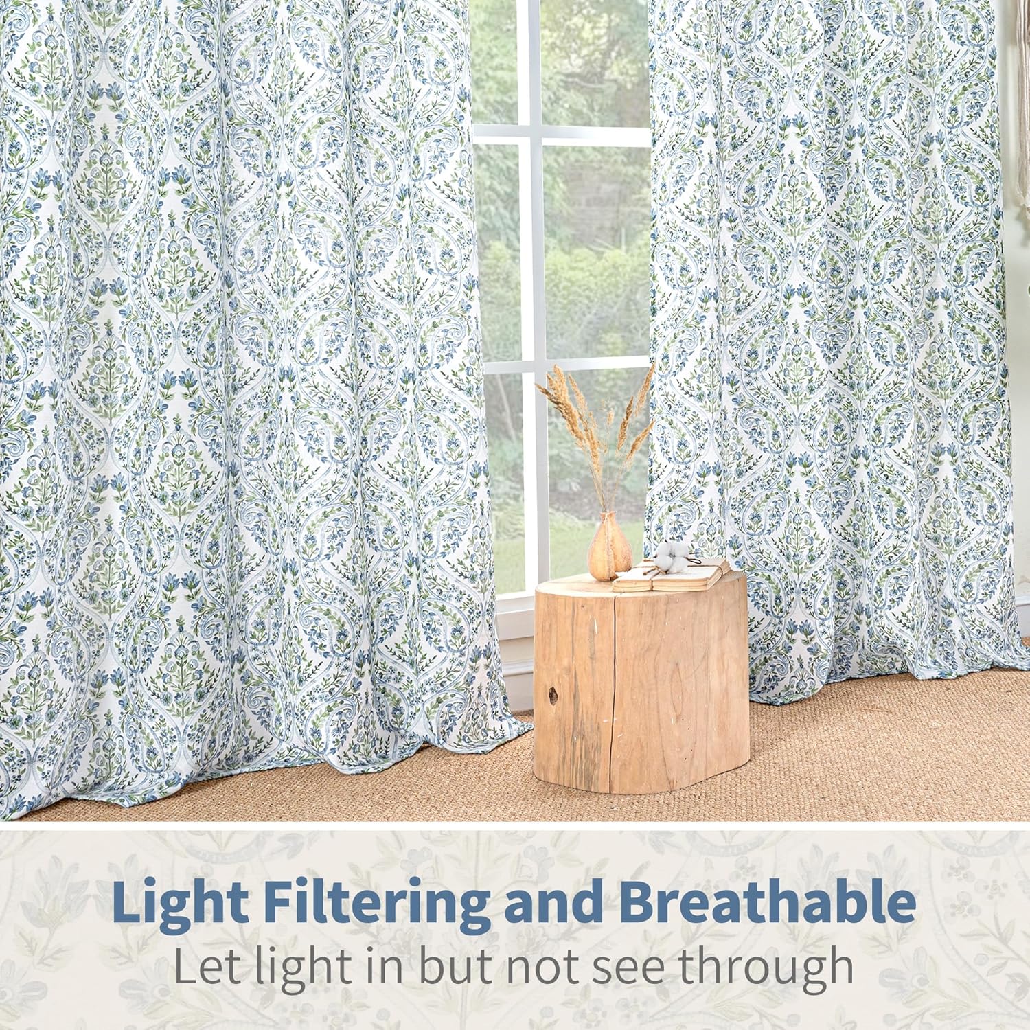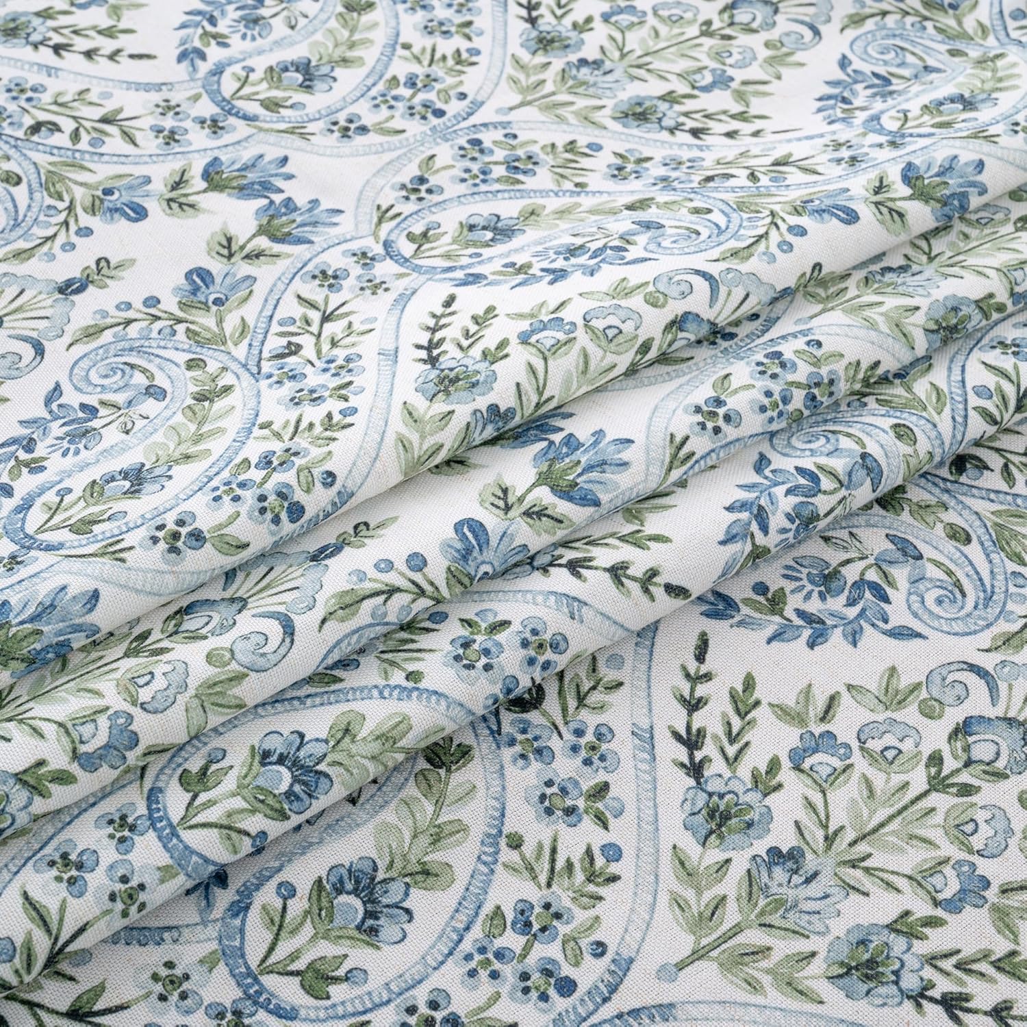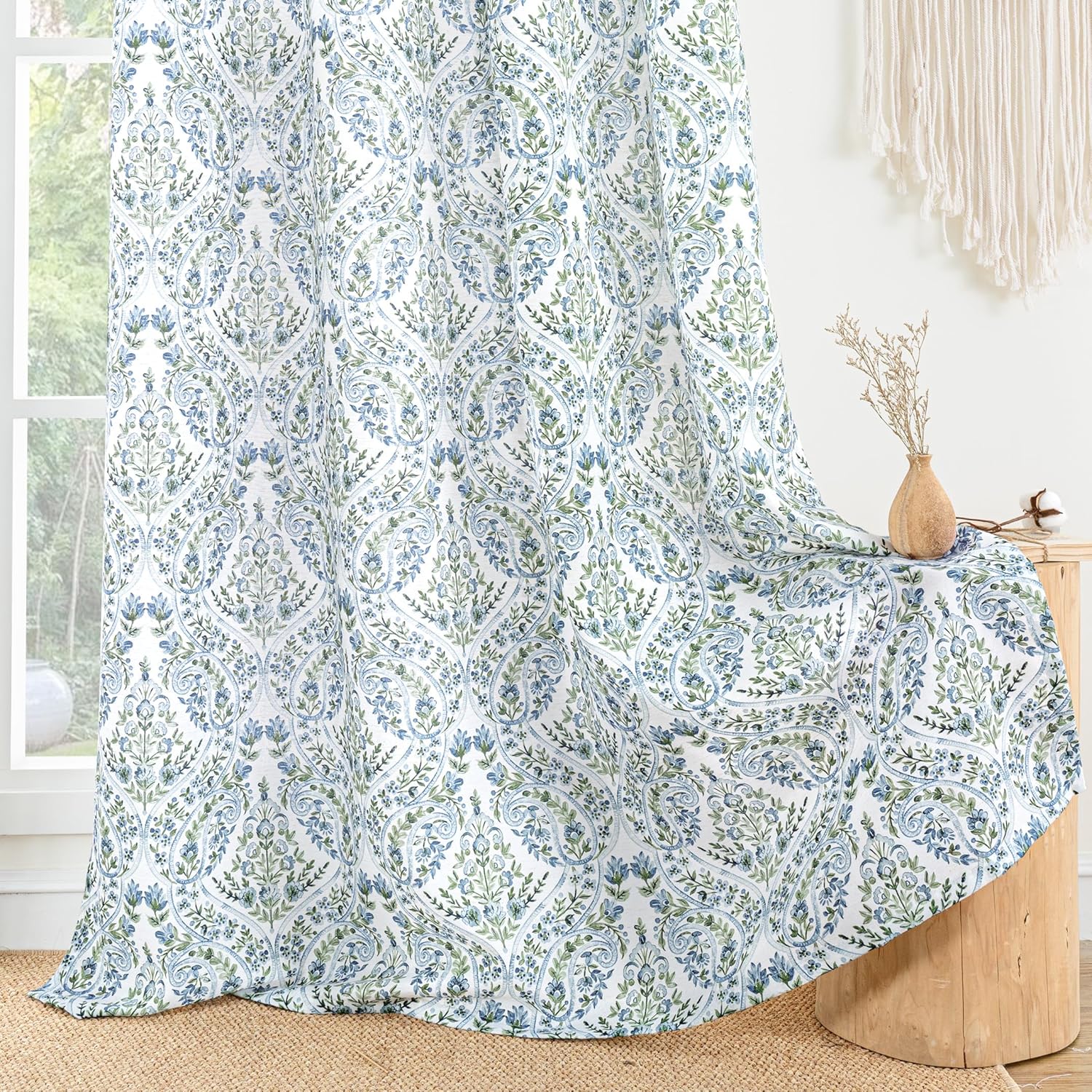 BGment Boho Curtains for Living Room – Linen Leaf Paisley Floral Pattern Light Filtering Grommet Window Semi Sheer Drapes for Farmhouse, 2 Panels, 52 x 84 Inch, Blue