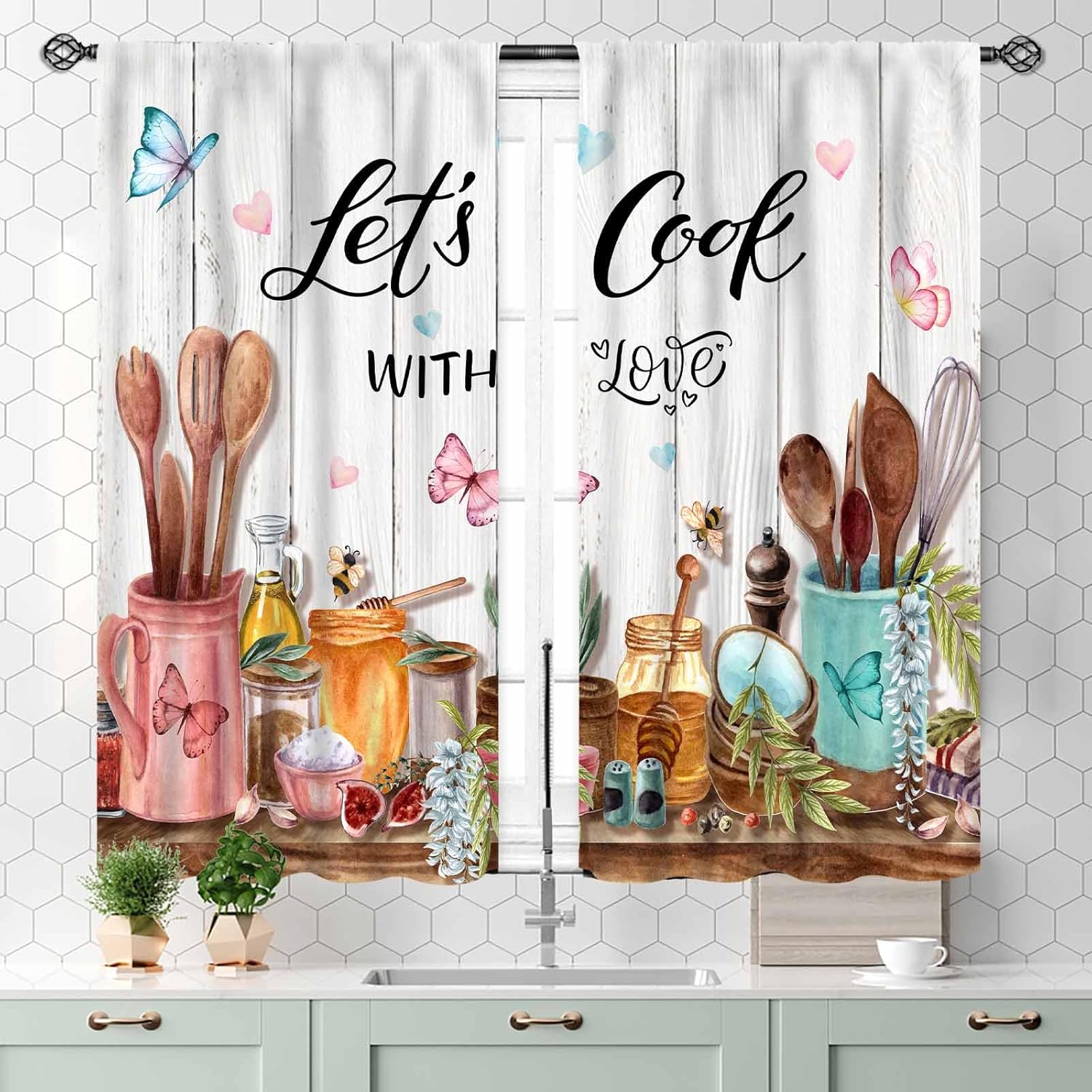 Farmhouse Kitchen Curtians, Rustic Country Fork and Spoon Cook Theme Rustic Vintage Cottage Blackout Cafe Living Room Bedroom Small Short Window Curtains Drapes Treatments 2 Panel Sets, 55×39 Inch