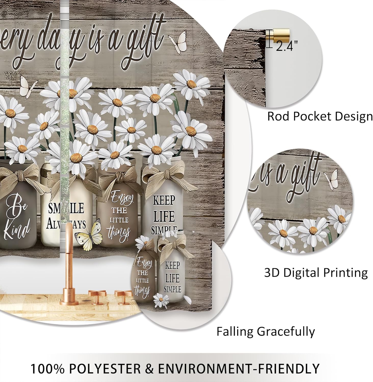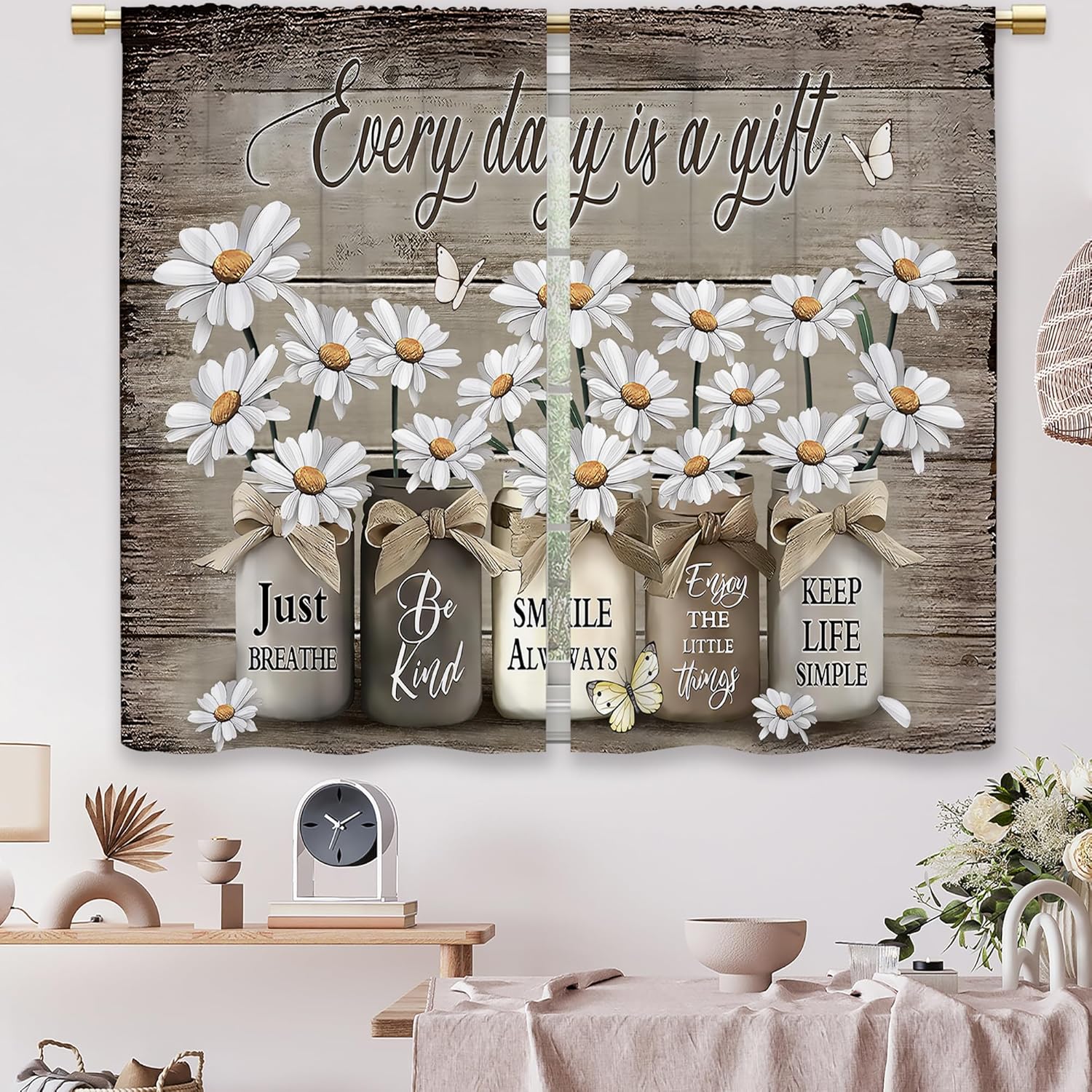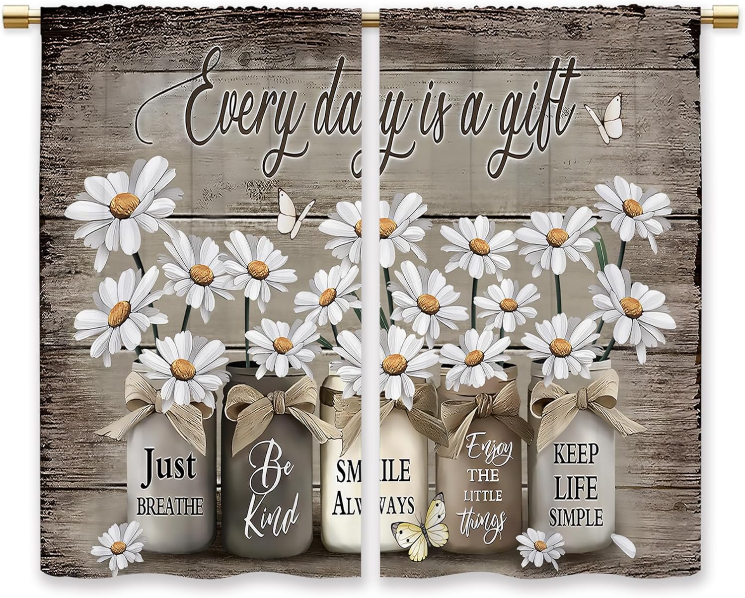 Laifzere Farmhouse Floral Kitchen Curtains Daisy Rustic Vintage Flower Inspirational Small Short Cafe Window Curtains Wooden Country Quotes Bathroom Tier Window Treatment Drapes (27.5×39 Inch)